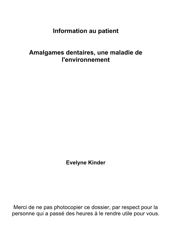 Cette brochure est un outil de base pour approcher le problème des amalgames dentaires et les effets pour notre santé. Elle passe en revue les différentes approches de détoxication. Elle a été écrite avec une approche essentiellement axée sur la pratique. Madame Kinder détaille les différentes étapes pour appréhender la question des amalgames de manière efficace (Diagnostique, Préparation à la dépose, Dépose). Elle contient également à la fin une liste de symptômes qui vous sera extrêmement utile dans votre processus de détoxication